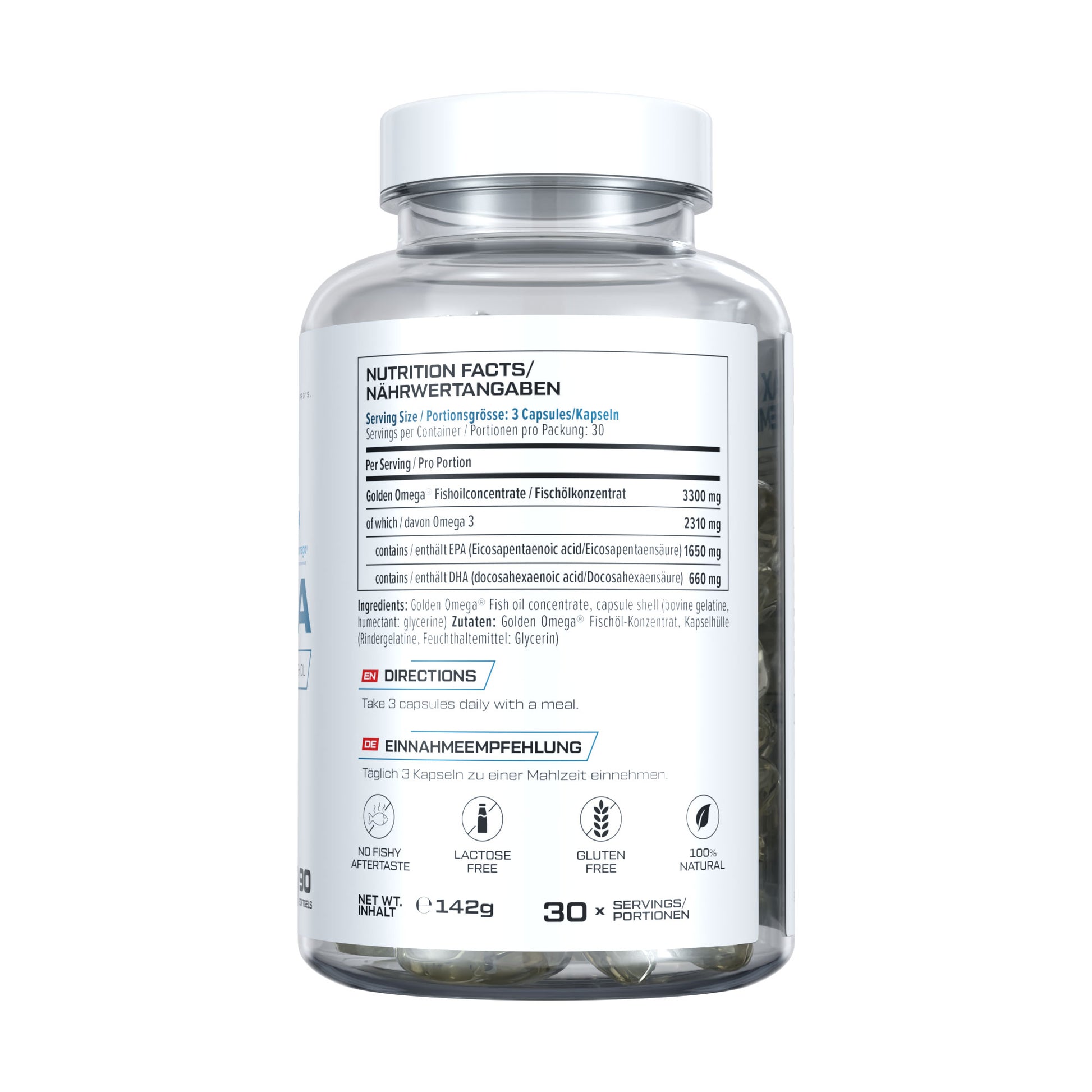 Ingredients: Golden Omega® Fish Oil Concentrate, Capsule Shell (Bovine Gelatin), Humectant (Glycerin)